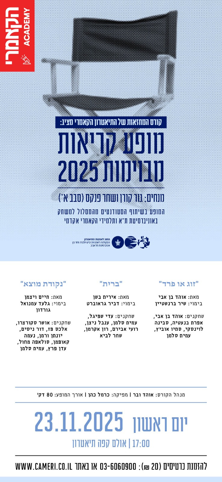 Ironically, I’m writing this English newsletter to notify you, my loyal English-language readers, about the first fruits of this new stage in my writing career. My story “Correlation Is Not Causation” appears in the current issue of the National Library of Israel’s on-line literary magazine, Mosach. (There’s a link there to hear it in audio as well, read by the talented Shir-Raz Gorenberg.) A scene from a new play, Nekudat Motza (Starting Point) will be presented in a staged reading at the annual festival of the Cameri Theater in Tel Aviv on Sunday, November 23, see the poster below.